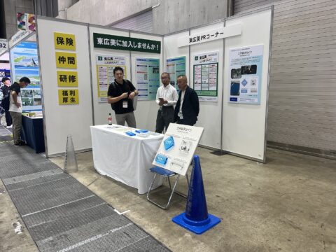 各ブースに混ざって東京屋外広告美術協同組合もPRコーナーを設置。組合への加入促進のPR。ひとり親方として活動をされている方も社会保険への加入や仕事の手を貸借りする仲間作り、情報交換や息抜きのための懇親会や新しい技術や商品を知る勉強会など、加入のメリットをパネルとパンフレットでお伝えしました。