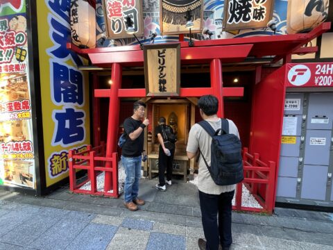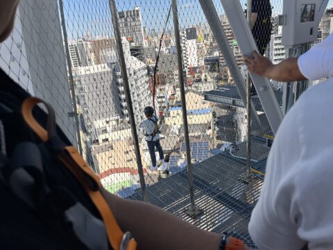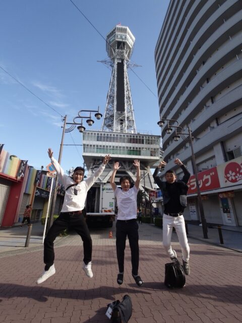 2日目は、大阪のシンボル「通天閣」の見学からスタートしました。8時45分に通天閣入口に集合し、グループごとに分かれて展望台やタワースライダー、ダイブ&ウォークといったアトラクションを楽しみました。